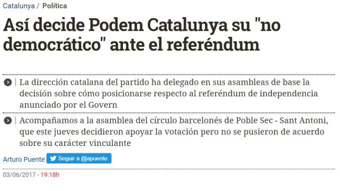 Los indicios, sino pruebas, se suceden. Incluso en las primeras páginas de los periódicos, pero en este clima tan denso, en el que el aire casi se puede mascar, poco campo hay para el análisis pausado de la realidad. Nos domina la emotividad; no la razón. Así, como muestra, este domingo en eldiario.es (http://www.eldiario.es/catalunya/politica/decide-democratico-postura-referendum_0_649886162.html ):