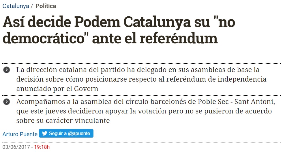 Leemos “La dirección catalana del partido ha delegado en sus asambleas de base la decisión”. Es decir, hay una dirección que delega. No hay una militancia que tiene poder, sino que necesita le sea delegado; delegado por su titular: la dirección. VIEJA POLÍTICA disfrazada de Lagarterana.