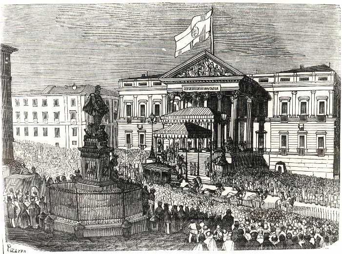 Como ha dicho Heine: "Es una vieja historia, y siempre ocurre igual". Espartero abandona a las Cortes; las Cortes abandonan a los jefes de la Guardia Nacional; los jefes abandonan a sus hombres, y los hombres abandonan al pueblo. El día 15, empero, se reunieron las Cortes con ocasión de una fugaz aparición de Espartero. El señor Asensio y otros diputados le recordaron sus reiteradas promesas de desnudar la gloriosa espada de Luchana el primer día que estuviera en peligro la libertad del país. Espartero puso al cielo por testigo de su indestructible patriotismo, salió, y todo el mundo esperó verle pronto en cabeza de la insurrección. Pero en vez de eso se dirigió a casa del general Gurrea, se encerró en un sótano a prueba de bombas, a la Palafox, y no se oyó más de él. Los comandantes de la milicia, que la tarde anterior habían recurrido a todos los medios para hacer tomar las armas a sus hombres, se mostraron ahora sumamente deseosos de retirarse a sus domicilios. A las dos y media de la tarde el general Valdés, que había usurpado durante algunas horas el mando de la milicia, convocó en la Plaza Mayor a los soldados bajo su mando directo y les dijo que el hombre que naturalmente tenía que estar a su cabeza no iba a aparecer, y que consecuentemente todo el mundo estaba autorizado a retirarse. A renglón seguido los guardias nacionales se precipitaron a sus casas se desprendieron precipitadamente de sus uniformes y escondieron sus armas. Tal es en sustancia la información suministrada por una autoridad bien informada. Otro informante da una nueva razón para explicar ese repentino acto de sumisión a la conspiración, a saber, que se pensó que el triunfo de la Guardia Nacional no haría más que provocar la ruina del trono y el predominio absoluto de la democracia republicana. La Presse de París da también a entender que el general Espartero, viendo el giro que tomaban las cosas en el congreso por obra de los demócratas, no quiso sacrificar el trono ni lanzarse al azar de la anarquía a la guerra civil e hizo todo lo que pudo para conseguir la sumisión a O'Donnell.