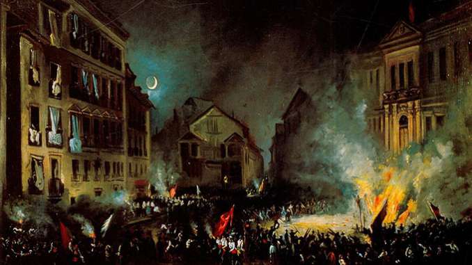 Una vez admitido ese plausible paralelo entre las conspiraciones españolas de 1843 y 1856, hay suficientes rasgos distintos en los dos movimientos para poner de manifiesto la magnitud de los pasos dados por el pueblo español en tan breve período. Esos rasgos son: el carácter político de la última lucha en Madrid, las posiciones respectivas de Espartero y O'Donnell en 1856 comparadas con las de Espartero y Narváez en 1843. En 1843 todos los partidos estaban cansados de Espartero. Para desembarazarse de él se constituyó una poderosa coalición de moderados y progresistas. Juntas revolucionarias surgidas como hongos en todas las ciudades prepararon el camino a Narváez y a sus partidarios. En 1856 no tenemos ya simplemente la corte y el ejército de un lado contra el pueblo de otro, sino que además tenemos en las filas del pueblo las mismas divisiones que en el resto de la Europa occidental. El 13 de junio el ministerio de Espartero presentó su forzosa dimisión; en la noche del 13 al 14 se constituyó el ministerio O'Donnell; en la mañana del 14 empezó a circular el rumor de que O'Donnell, encargado de la formación del gabinete, había invitado a Ríos Rosas, el malfamado ministro de los sangrientos días de julio de 1854, a que se le uniera. A las 11 de la mañana la Gaceta confirmaba el rumor. Las Cortes se reunieron entonces, con la presencia de 93 diputados. De acuerdo con la ley orgánica de ese cuerpo, 20 miembros bastan para convocarlo y 50 para constituir un quorum. Las Cortes además no habían sido aplazadas formalmente. El general Infante, presidente de las Cortes, no tuvo más remedio que cumplir el general deseo de celebrar una sesión ordinaria. Se presentó una moción que declaraba que el nuevo gabinete no disfrutaba de la confianza de las Cortes y que Su Majestad debía ser informada de este hecho. Al mismo tiempo, las Cortes invitaron a la Guardia Nacional a mantenerse presta para actuar. La comisión portadora de la resolución que negaba la confianza al gobierno se dirigió a visitar a la reina, escoltada por un destacamento de la milicia nacional. Pero aunque insistieron en entrar en Palacio fueron rechazados por tropas de línea que hicieron fuego sobre la comisión y su escolta. Este incidente fue la señal para la insurrección. La orden de levantar barricadas fue dada a las 7 de la tarde por las Cortes, disueltas inmediatamente después por las tropas de O'Donnell. La lucha comenzó aquella misma noche, y sólo un batallón de la milicia nacional se unió a las tropas reales. Vale la pena indicar que ya en la mañana del 13 el señor Escosura, ministro esparterista del Interior, había telegrafiado a Barcelona y Zaragoza informando de la existencia del golpe de estado y ordenando que se preparara la resistencia. A la cabeza de los insurrectos de Madrid se colocaron el señor Madoz y el general Valdés, hermano de Escosura. En resolución, no puede caber la duda de que la resistencia al golpe de estado procede de los esparteristas y de los ciudadanos y liberales en general. Mientras éstos tomaban posiciones a lo largo de una línea que divide Madrid de este a oeste, los obreros, dirigidos por Pucheta, ocuparon las zonas sur y norte de la ciudad.