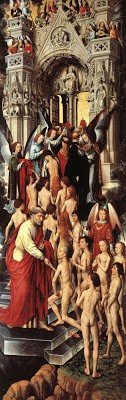 Hoja izquierda: Recepción de los salvos en el cielo, entre ellos sitúa Memling el retrato de Tommaso Portinari, representante de la Banca Medici en Brujas y uno de los clientes del pintor, pero su rostro es un añadido posterior, probablemente hacia 1781. San Pedro, en mayor tamaño que el resto, recibe a las almas salvas que llegan desnudas y van siendo vestidas por los ángeles, muchos de ellos son retratos de gentes conocidas por el autor. La procesión la encabezan el Papa, cardenales y obispos. Aparecen hombres de color tanto entre los salvos como entre los condenados. El gran pórtico de acceso al cielo envuelve formas góticas y torres románicas, es la Nueva Jerusalén o Jerusalén Celestial. Entre los relieves, el que corona, es la creación de Eva en el Gablete, enlazando el inicio y el fin de la historia de la humanidad.