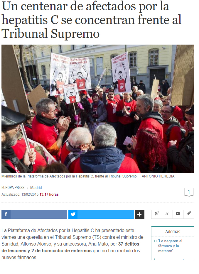 “El Gobierno dice que fue la Comunidad quien negó fármacos a Isabel, muerta en Móstoles (…) El dato fue facilitado el viernes pasado, a este diario, por fuentes del propio Ministerio, que explicaron que corresponde a las comunidades autónomas la decisión de a qué pacientes se les administra sofosbuvir”; “El Hospital de Móstoles sostiene que Sovaldi no habría curado a la paciente (...)Una de las líneas de defensa de la Comunidad la avanzó el propio viernes a este diario una fuente del Hospital de Móstoles, donde fue tratada la paciente: según el centro, el sofosbuvir sólo cura en un 90% tres tipos de cepas, y «no el hepatocarcinoma que tenía la paciente»”.