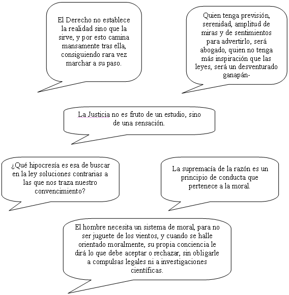 CÓMO SE HACE UN DESPACHO. La condición inexcusable para triunfar en una profesión es sabré ejercerla. Un tonto puede prevalecer en lo que depende de la merced, mas no en lo que radica en el crédito público. Medios que un letrado tiene para darse a conocer: La Asociación. O sea, trabajar en colaboración, estableciéndose bajo una razón social dos o más compañeros y creando entre todos un consultorio. Repruebo sin vacilar ese procedimiento por esencialmente incompatible con nuestra profesión. ¿Cómo será posible dividir en partes alícuotas la estimación de un problema y el modo de tratarle y la responsabilidad del plan adoptado? El anuncio. Aunque algunos lo admiten, afortunadamente la mayoría lo considera como una degradación. Es lícito decir "yo vendo buen café" ¡pero es grosero anunciar "yo tengo honradez y talento"!. Sólo con atreverse a decir esto, se está demostrando la carencia de las prendas más delicadas e indispensables en la psicología forense. La exhibición. Aunque duela un poquillo la palabra, hay que usarla en su aceptación noble, para venir a parar en que éste es el único medio lícito para darse a conocer. Poner en manifiesto lo que llevamos dentro y lo que somos capaces de hacer. Hablar de los compañeros que se han dado a conocer como letrados después de haber sido Ministros. Estos son casos aislados y no constituyen sistema. ESPECIALISTAS. Si el hombre es siempre esclavo de la misma tarea, se degrada. En la abogacía, la especialización toca los limites del absurdo. Simplemente no se puede ser especialista en una sola cosa, porque en la abogacía como en muchas otras profesiones, en un solo caso, gran parte de las veces, se necesita de varias materias de Derecho. Nuestro campo de acción es el alma, y esta no tiene casilleros. ¿Se concibe un confesor para la lujuria, otro para la avaricia y otro para la gula? ¡Pues igual en nuestro caso! No es indiferente ni inofensivo el proceder mediante especializaciones, porque ellas, aún contra nuestra voluntad, pesan enormemente en el juicio y unilateral izándose nos llevan al error. El civilista nunca creerá llegada la ocasión de entrar en una causa, cuando, a veces, con una simple denuncia se conjuraría el daño o se prepararía el arreglo; el criminalista todo lo verá por el lado penal y fraguará procesos quiméricos o excusará delitos evidentes. Esta y no otra es la razón de que tan pocas veces un profesor en un buen abogado. El profesor ve un sector de la vida, forma en él su enjuiciamiento... y todo lo demás se le escapa. Convenzámonos de que en el foro. Como en las funciones de gobierno, no hay barreras doctrinales, ni campos acotados, ni limitaciones del estudio. Para el abogado no debe haber más que dos clases de asuntos: unos en que hay razón y otros en que no la hay LA HIPERBOLE. La exageración de la verdad, tan común entre los abogados, debe ser evitada. El buen gusto suele correr parejas con la dignidad y el pudor. Quien sepa guardar su recato y ocupar su puesto, de fijo no fraternizará con sus clientes en lo criminal ni los divinizará en lo civil. Antes de abrir los registros estruendosos, mire bien si el caso lo merece o no; y en caso de duda, haya de la hipérbole y aténgase al consejo cervantino: Llaneza muchacho, llaneza. LIBERTAD DE DEFENSA. El particular debe ser libre para defenderse por sí mismo. Salvo en los casos en que esa libertad puede dañar al derecho de las otras partes o al interés público. Para el ciudadano es vejatorio que le obliguen a decir por boca ajena lo que podría expresar con la propia, y que una cosa tan natural como el pedir justicia haya de confinarla precisamente a un técnico. El pretorio debería tener sus puertas abiertas a todo el mundo, sin atender a otro ritualismo que al clamor de quien solicita lo que ha de menester. Con ello los abogados ganaríamos en prestigio sin perder sensiblemente en provecho. Lo primero, porque al no ser nuestro ministerio forzoso, sino rogado, se acrecentaría nuestra autoridad. Lo segundo, porque serían pocos los casos en que se prescindiera de nuestra tutela. Pero se trata de una cuestión de principios, y aunque hubiera de desaparecer por inútil nuestra profesión, esto sería preferible a mantenerla cohibiendo a la sociedad entera y permitiendo que, en vez de buscarnos, nos soporte. EL AMIANTO Tengo a los financieros mucha consideración porque sin su capacidad de iniciativa, sin su sed de oro, sin su acometividad y sin su ética maleable, muchas cosas buenas quedarían inéditas y el progreso material sería mucho más lento. Mas no concibo al Abogado Financiero, por la sencilla razón de que si es financiero no puede se r Abogado. Si un abogado es Financiero, porque al serlo, estarían mezclando el interés propio con el ajeno y poniendo en cada asunto el albur de hacerse poderosos, vienen a consagrar inmensos pactos de cuota-bilis; una cuota-litis hipertrofiada. Poder y riqueza, fuerza y hermosura, todas las incitaciones, todos los fuegos de la pasión han de andar entre nuestras manos de abogados sin que nos quememos. El mundo nos utiliza y respeta en tanto en cuanto tengamos la condición del amianto. LOS PASANTES Para la generalidad de los licenciados, las obligaciones del pasante aparecen establecidas en este orden: 1ª. Leer los periódicos. 2ª. Liar cigarrillos y fumarlos en abundancia cuidando mucho de tirar las cerillas, la ceniza y las colillas fuera de los ceniceros. 3ª. Comentar las gracias, merecimientos y condescendencias de las actrices y cupletistas de moda. 4ª. Disputar - siempre a gritos - sobre política, sobre deportes y sobre el crimen de actualidad. 5ª. Ingerir a la salida del despacho cantidades fabulosas de patatas fritas a la francesa, pasteles, cerveza y vermouth. 6ª. Leer distraídamente autos, saltándose indefectiblemente los fundamentos de derecho en todos los escritos y, en su integridad el escrito de conclusiones. La enseñanza del bufete no tiene otra as