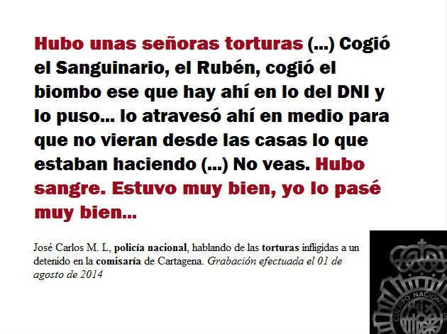 Y se ha de recordar además que estos hechos tienen lugar en Cartagena, cuya Comisaria ha sido objeto de inspección por el Defensor del Pueblo (http://www.defensordelpueblo.es/evento-mnp/comisaria-del-cnp-de-cartagena-murcia/ ; http://www.laopiniondemurcia.es/comunidad/2010/09/25/defensor-pueblo-inspecciona-comisarias-region/272526.html) y sus agentes investigados en diversos procesos judiciales “acusados de dar palizas”, de torturar (http://politica.elpais.com/politica/2014/10/24/actualidad/1414174239_391025.html).