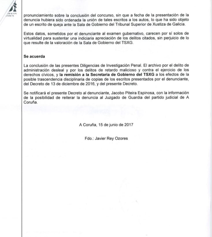En cualquier caso, la denuncia fue admitida a trámite e incoadas Diligencias Previas num. 33/2017, ante el Juzgado de Instrucción núm. 2 de A Coruña, incoación que no parece haya sido recurrida por el Ministerio Fiscal y en las que se me ha recibido declaración en calidad de investigado. Al margen de la falta de tipicidad de mi conducta y que ello sea así valorado con prontitud en la jurisdicción penal, desde luego la denuncia, en los términos en que se ha efectuado, y la pronta respuesta judicial en ese caso, agudizan, por comparación, la ignominia que padezco.
