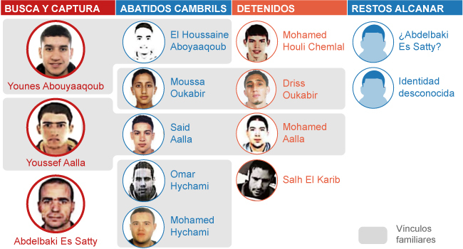 Hubo cuatro detenidos, tres en Ripoll, de nacionalidad marroquí, y otro en Alcanar —nacido en Melilla—. Dos de los detenidos en Ripoll fueron el hermano de Moussa Oukabir y un amigo del mismo. Otro individuo herido la madrugada del jueves en la explosión de Alcanar también fue detenido. Según los Mozos de Escuadra, el atropellamiento en Barcelona estaría relacionado con una explosión que ocasionó el derrumbamiento de una casa en Alcanar un día antes, el 16 de agosto. En esta casa había numerosas bombonas de butano y explosivos de fabricación casera. Su explosión obligó a los terroristas, según la policía, a cambiar los planes y optaron precipitadamente por el atropello masivo en la Rambla. El 19 de agosto se identificó al imán de Ripoll, Abdelbaki Es Satty, también de nacionalidad marroquí, como el agente radicalizador de los jóvenes terroristas y posible cabecilla de la célula. El 21 de agosto se confirmó la muerte del imán en la explosión del chalet de Alcanar. Ese mismo día fue abatido Younes Abouyaaqoub en Subirats.