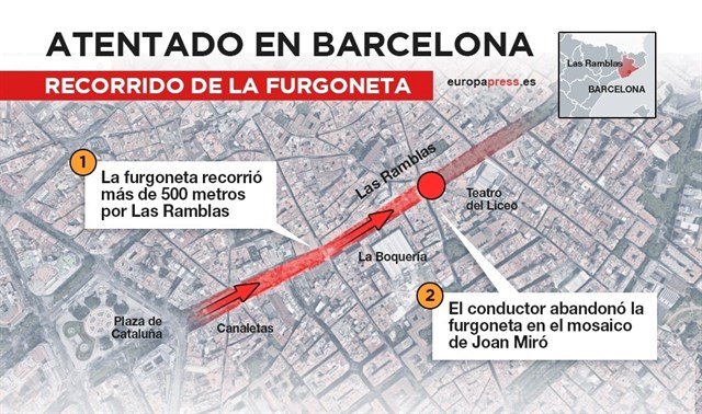 Al siguiente día, el 17 de agosto al mediodía, los restantes terroristas improvisaron un ataque en un lugar muy popular entre los turistas, las Ramblas, con una furgoneta. 15 personas son asesinadas y más de 100 heridas. Las víctimas eran de 34 nacionalidades. La policía catalana encontró y abatió a los terroristas rápidamente.