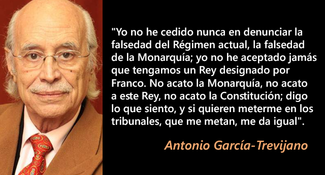 Antonio García-Trevijano Forte (Alhama de Granada 18 de julio 1927-Madrid 1 de marzo 2018) ha sido despedido con obituarios que le describen de modo coincidente como jurista, abogado, político y pensador republicano. Se mencionan algunas iniciativas casi desconocidas como su intervención en los preparativos de una huelga de 1967 y también su condición de promotor de la Junta Democrática en julio de 1974 donde le acompañaba el Partido Comunista de Santiago Carrillo y algunos connotados juanistas como Rafael Calvo Serer.