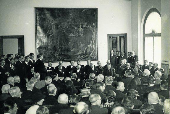 Los invitados a la inauguración del Colegio, en 1935. Unamuno, señalado con el círculo. / ABC