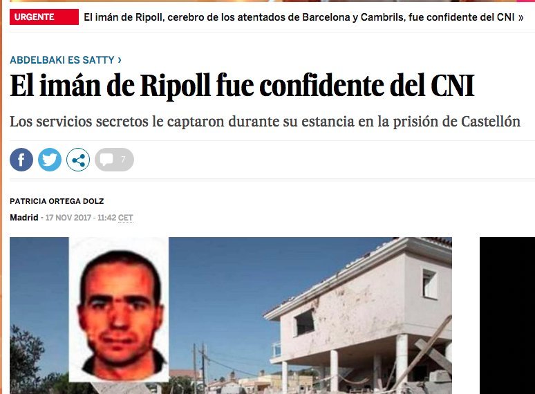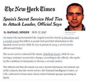 Muestra de uno de los artículos en el que el "New York Times", entre otros muchos importantes periódicos del extranjero, informan acerca de que «el Servicio secreto español tenía vínculos con el líder de los atacantes» de los atentados de agosto de 2017 en Cataluña. Lo curioso es que en España no solo se silencia en los medios todo lo relacionado con el asunto, sino que ni siquiera se permite la investigación parlamentaria.