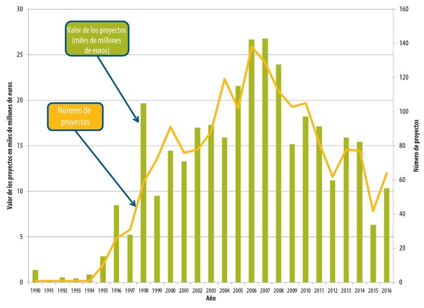 Según el centro europeo de asesoramiento sobre las asociaciones público-privadas (EPEC), entre 1990 y 2016 alcanzaron la fase de cierre financiero en el mercado de APP de la UE 1 749 proyectos de APP por valor de un total de 336 000 millones de euros. Antes de la crisis financiera y económica el mercado de APP experimentaba un aumento pronunciado de volumen, pero desde 2008 el número de proyectos de nuevas APP ha disminuido considerablemente (véase la ilustración 2). En 2016, el valor agregado de las 64 operaciones de APP que alcanzaron el cierre financiero en el mercado de la UE fue de 10 300 millones de euros. La mayoría de proyectos se desarrollaron en el sector del transporte, que en 2016 representaba un tercio del total de las inversiones de APP, seguido de los sectores de la asistencia sanitaria y la educación.