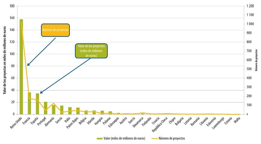 Tal y como muestra la ilustración 3, el mercado de APP de la UE se concentra sobre todo en el Reino Unido, Francia, España, Portugal y Alemania, que ejecutaron proyectos equivalentes al 90 % de todo el mercado a lo largo del período 1990-2016. Si bien algunos Estados miembros ejecutaron numerosos proyectos de APP, como el Reino Unido, con más de 1 000 proyectos de APP por valor de casi 160 000 millones de euros durante dicho período, seguido de Francia con 175 APP por valor de casi 40 000 millones de euros, 13 de los 28 Estados miembros ejecutaron menos de cinco proyectos de APP.