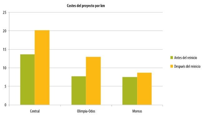 • Aún más importante es el hecho de que en Grecia (que es con diferencia el mayor receptor de contribuciones de la UE, con el 59 % del total del importe procedente de la UE, o 3 300 millones de euros), el coste por kilómetro de tres autopistas auditadas había aumentado hasta el 69 %, mientras que al mismo tiempo se redujeron hasta un 55 % los alcances de los proyectos. Esto se debió principalmente a la crisis financiera y a la mala preparación de los proyectos por el socio público, lo que dio lugar a contratos prematuros y poco eficaces con concesionarios privados.