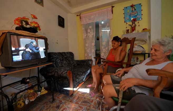 Una familia cubana mira en la televisión el momento que Raúl Castro felicita a Miguel Díaz-Canel tras haber sido elegido presidente de Cuba (AFP)