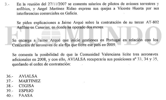 Los firmantes especificaron las áreas de influencia de cada empresa que el resto debía respetar: Avialsa en Valencia y Cataluña; Martínez Ridao en Mallorca, Castilla la Mancha, Andalucía y Galicia; Espejo en Canarias y Andalucía; Faasa en Castilla y León, y Cegisa —por medio de Inaer— en Portugal. El acuerdo firmado entre los gerentes de las empresas, cuyo acto fue filmado para asegurar su cumplimiento en un futuro, estipulaban el pago de una cuota para adquirir nuevas naves anti incendios, o para compensar a una empresa que hubiera perdido un contrato en una de sus áreas de influencia, ya fuera a manos de otra empresa fuera del cártel o de una perteneciente a éste. Los representantes de las 14 empresas investigadas en la causa iniciada en Valencia se enfrentan a acusaciones de pertenencia a organización criminal, alteración de precios en concursos públicos y delito continuado de falsedad en documento mercantil.