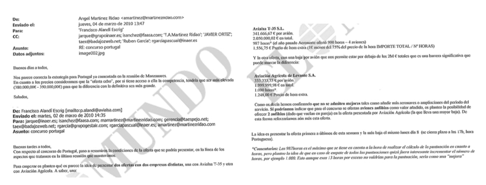 «Amigos todos. Tras la reunión ayer en Madrid referente al concurso en Portugal, paso a resumir lo que pensamos que debe hacerse. Contactar con Ribeiro para ofrecerle entrar con nosotros [...] Recopilar toda la información de aviones y empresas para presentarla al concurso con o sin Ribeiro [...] Los detalles de nuestra oferta dependerán de que tengamos enemigos [Ribeiro] o no, y pueden ser comentados entre nosotros a última hora antes de presentar», es sólo una parte de un correo electrónico que muestra cómo actuaba la red.