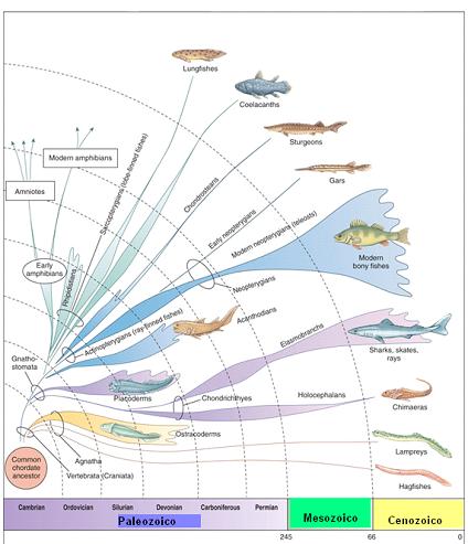 "Homogeneizados" superficialmente por adaptación mecánica a la natación, los Peces (sería mejor llamarlos Pisciformes) son monstruosamente complejos en su conjunto. ¡Cuántas Capas aquí, especialmente acumuladas y confundidas bajo el mismo vocablo! ... Capas relativamente jóvenes, desarrolladas en los Océanos en la misma época en que se extendían sobre los continentes las de los Tetrápodos a`. Capas antiguas todavía mucho más numerosas, que se terminaban muy por abajo, hacia el Silúrico, en un verticilo fundamental del cual divergen ante nuestros ojos dos radios principales: los Pisciformes sin mandíbulas, con una sola apertura nasal, representados en la naturaleza actual solamente por la lamprea; y los Pisciformes con mandíbulas, con dos aperturas nasales, de las cuales emergió todo el resto.