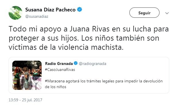 Tuit de Susana Díaz en apoyo de Juana Rivas en julio de 2017.
