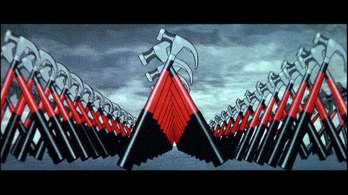 Sin embargo, el territorio en el que se mueve el tándem Roger Waters/Alan Parker es necesariamente diferente al del cine clásico, por mucho que de manera constante podamos rastrear guiños irónicos (pensemos, por ejemplo, en los planos de los soldados marchando en el crepúsculo, sostenidos sobre imposibles cielos malvas y naranjas al estilo del John Ford de El precio de la gloria [What Price Glory, 1952]), encontrándonos ahora muy lejos de la problemática del cumplimiento del deber y de la reivindicación de la figura del mártir. Antes bien, lo que pretendemos señalar es que The Wall se construye precisamente como una respuesta desesperada a la quiebra misma del cine clásico, a la imposibilidad de seguir levantando la estructura del relato atravesado por los Ejes de la Ley y del Deseo.