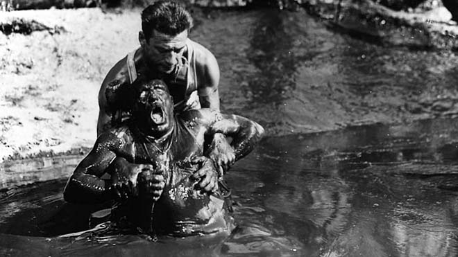 ‘El salario del miedo’ nos lleva, con un inicio que años más tarde repetiría Sam Peckinpah en ‘Grupo salvaje’ (‘The Wild Bunch’, 1969) —unos niños torturando a unos bichos—, a un pueblo fronterizo en el que la vida es poco menos que miserable. La pobreza lo inunda todo, y unos personajes que llegaremos a conocer a fondo se las ingenian para sobrevivir día a día. Este tramo ocupa aproximadamente unos 50 minutos de metraje, y Clouzot utiliza la cámara para acercarse a lo tristes y míseras que pueden ser las vidas de las personas. De una aterradora descripción, el realizador se toma su tiempo en hablarnos de unos personajes de lo más variopinto, la mayoría de ellos hombres. En dicho retrato no existen ni el blanco ni el negro, sino una sugerente gama de grises que visten cada una de las personalidades que pululan por ese pueblo, perdido de la mano de Dios. Aunque dicho tramo es una presentación, y el meollo de la película viene en su segundo tramo, es una parte prodigiosa que revela a Clouzot como un perfecto creador de atmósferas —la suciedad que impregna las vidas de los personajes prácticamente puede palparse—, y sobre todo como un gran narrador.