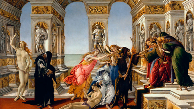 | LA CALUMNIA DE APELES – Sandro Botticelli (1.495): APELES fue el pintor favorito de Alejandro Magno. “A la derecha está sentado un hombre con largas orejas, casi como las de Midas, desde lejos tiende su mano a la Calumnia que avanza. Cerca de él, dos mujeres, probablemente la Ignorancia y la Sospecha. Por el lado opuesto se aproxima la Calumnia bajo la forma de una mujer extremadamente bella, pero con la cara inflamada, muy excitada, como bajo el influjo de la ira y el furor; en su mano izquierda lleva una antorcha encendida, y en la otra arrastra de los cabellos a un joven que levanta los brazos al cielo y toma a los dioses como testigos. Su guía es un hombre pálido, feo, de mirada penetrante, que parece extenuado por una larga enfermedad. Se puede admitir que es la Envidia personificada. Otras dos mujeres además acompañan a la Calumnia, la animan, le arreglan sus vestidos y su cabello; a decir del guía que me guiaba, una era la Acechanza y la otra la Perfidia. Tras de ellas marcha una mujer con ropa de gran duelo, los vestidos negros y en jirones: es, se me recuerda, el Arrepentimiento; al menos vuelve la cabeza llorando, levantando los ojos con extrema confusión hacia la Verdad que se acerca". Texto de Luciano de Samósata “De Calumnia” – Joaquín Yarza (Fuentes para la Historia del Arte I, Madrid, 1997, pp. 99-100), sobre la obra original –perdida- de Apeles (352 a 308 a.c.) |