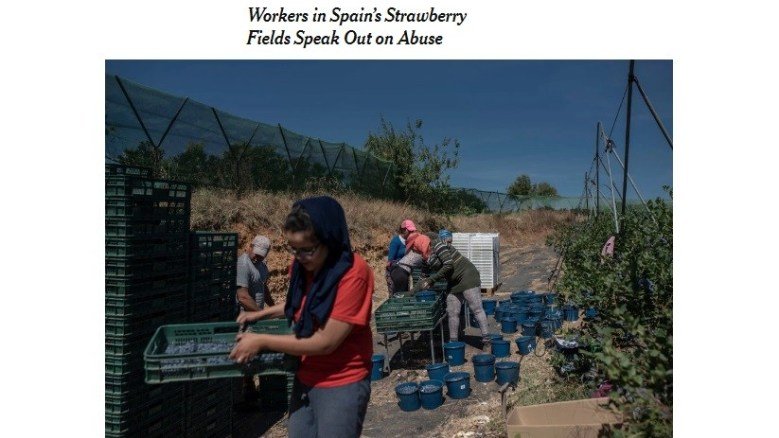 Las situaciones abuso y acoso laboral y sexual sufridas por trabajadoras marroquíes contratadas en origen para las campañas de recogidas de frutos rojos en la provincia de Huelva siguen siendo objeto de interés informativo para destacados medios de comunicación internacionales. Esta vez ha sido el prestigioso diario estadounidense The New York Times, considerado la «biblia del periodismo», el que dedicaba en su edición del sábado un extenso artículo a las conocidas en España como Temporeras contra la Esclavitud, 10 mujeres que el pasado año denunciaron diferentes abusos y coacciones en la finca almonteña Doñana 1998, y cuyos casos siguen pendientes de resolver en dos juzgados de la La Palma del Condado (Huelva).