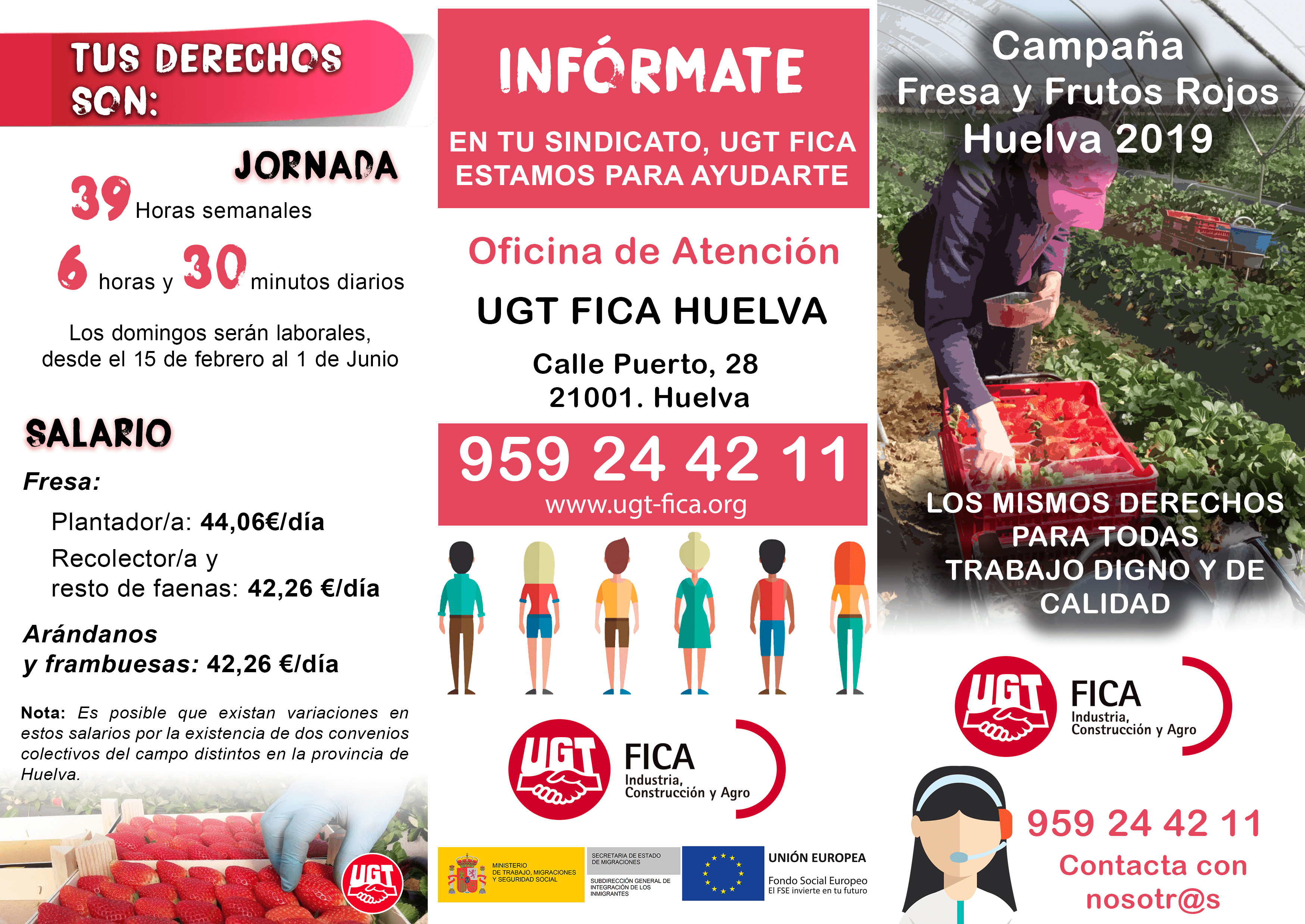 El tríptico, editado también es castellano y financiado por el Ministerio de Trabajo, Migraciones y Seguridad Social y el Fondo Social Europeo, responde a una iniciativa del sindicato ugetista que fue presentada el pasado mes de enero por el secretario general de FICA UGT Huelva, Luciano Gómez, tras una reunión mantenida con el Cónsul General de Marrueco en Andalucía, Farid Aoulouhaj. Gómez también anunció la puesta en marcha de una “oficina móvil”, y trasladó al representante del rey de Marruecos la disposición del sindicato a velar por sus derechos laborales y condiciones sociales durante la estancia en España de las mujeres temporera contratadas en origen en el país vecino, así como a facilitar asistencia y asesoramiento legal a las que pudieran necesitarlo. Con este fin, en el folleto se incluye un teléfono al que las jornalera deben llamar para ser atendidas.