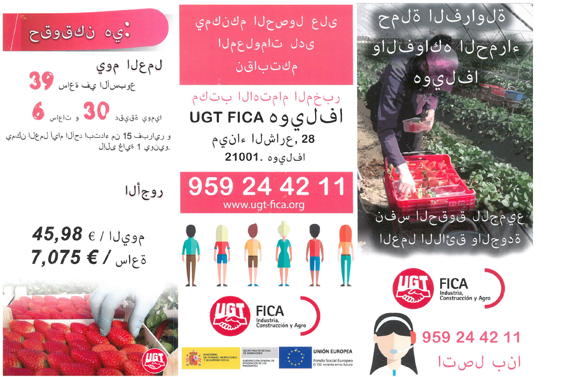 FICA UGT asegura haber estado distribuyendo durante los últimos meses miles de ejemplares de un falso «tríptico explicativo» editado en un supuesto idioma árabe con información sobre los derechos laborales y sociales que asisten a las mujeres marroquíes contratadas en origen, durante la campaña de recogida de frutos rojos que se desarrolla entre los meses de enero y junio y acaba de darse por finalizada.