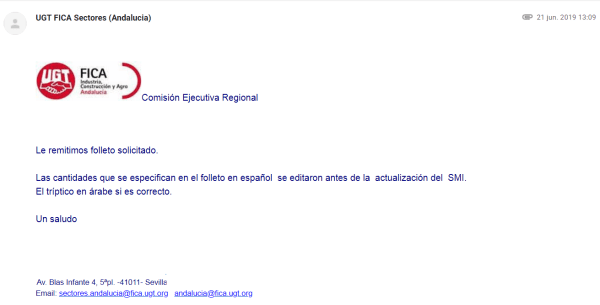 En Sevilla, efectivamente, sí disponen de ambos trípticos, el editado en español y el que está “en árabe”, y se ofrecen a remitirlos de nuevo, ya que –explicamos- el otro no “podemos leerlo bien”. A los pocos minutos volvemos a recibir los dos folletos, cogidos del montón que el sindicato tiene allí a disposición del público , y «recién escaneados» expresamente para La Mar de Onuba.