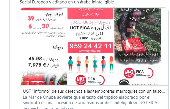 Este mismo lunes, un portavoz de la poderosa Federación de Industria, Construcción y Agro (FICA) de UGT confirmaba a La Mar de Onuba que, efectivamente, el folleto editado en árabe es ilegible e inservible, y ha agradecido a esta revista haber advertido el monumental fallo cometido. Un error que, empero, el sindicato ha atribuido a la imprenta encargada de su elaboración, cuyo “software de edición ha resultado incompatible con él árabe”. UGT FICA va exigir -pues- a la imprenta que vuelva a imprimir los miles de folletos; esta vez sin errores, y, «por supuesto, sin coste alguno para el sindicato».
