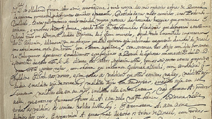 Asisto, de nuevo, con perplejidad —esta sí, casi la misma de hace 15 años— a la escena, mitificada, convertida ya en leyenda, de Baruch (o Bento, o Benito, o Benedictus) de Spinoza (o Espinosa, o Despinosa, o Espinoça) siendo excomulgado el 27 de julio de 1656, según la narra Albiac: “Grave solemnidad de la voz anciana del Haham, desgranando, lenta, el rosario meticuloso de las maldiciones, en este atardecer, que no es difícil imaginar impregnado por la humedad pegajosa del verano en la ciudad del Amstet. (…) Rodaría aún el eco venerable de la larga maldición en los oídos de los fieles congregados, mientras las luces, lentamente, de las velas habrían ido siendo, una a una, extintas; embriagador aroma de la cera, pabilos humeantes, retumbar del sonido del cuerno en las cabezas de los fieles. Toda la gran liturgia. Suntuosidad del barroco en el espacio arquitectónico, casi milagrosamente limpio, de la Sinagoga. (…) Como en una pesadilla recurrente, el auto de fe gravita, entretejido en la trama misma de la palabra propia, poder último y solo unificante de un pueblo disperso y perplejo”.