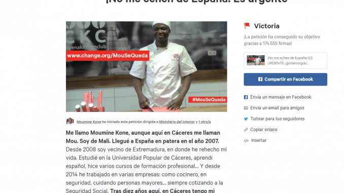 “¡No me echen de España! Es urgente”. Así iniciaba su petición el maliense Moumine Kone, aficando en Cáceres desde hace una década, que recogió más 175.000 firmas de apoyo para evitar su expulsión de España.