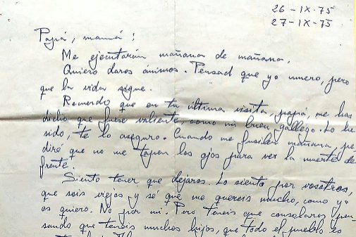 “Me ejecutan mañana de mañana. Quiero daros ánimos. Pensad que yo muero, pero que la vida sigue (…) Cuando me fusilen mañana pediré que no me tapen los ojos para ver la muerte de frente. (…) ¿Recordáis lo que dije en el juicio?: "Que mi muerte sea la última que dicte un tribunal militar". Ese era mi deseo, pero tengo la seguridad de que habrá muchos más”.