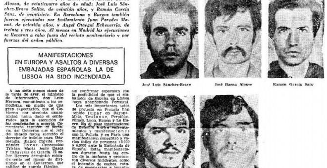 “La consulta de los más de dos mil folios de los procesos que se instruyeron contra ellos no deja lugar a la duda: fueron víctimas de un simulacro de justicia que los sentenció antes de juzgarlos”. Carlos Fonseca sentencia en su libro Mañana cuando me maten la “condena macabra” de aquellos últimos Consejos de guerra que terminaron con la vida de cinco jóvenes militantes de izquierdas. “Las pruebas fueron obtenidas mediante torturas o burdamente manipuladas y se les privó de las mínimas garantías de defensa”. Sus familias nunca han recibido ningún gesto de perdón ni de justicia por aquel crimen. Victoria Sánchez-Bravo destaca en el 44 aniversario de los asesinatos a Público que “ninguno de los gobiernos democráticos ha querido pedir disculpas ni anular esta condena”.