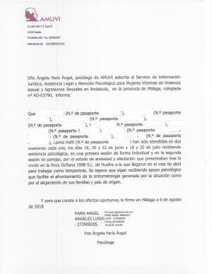 En otro hecho probado de la sentencia, el XV, Liñán recoge, en diez renglones, un segundo informe psicológico aportado como prueba pericial. Está firmado en Málaga el 6 de agosto del año pasado por Ángela París Ángel, psicóloga adscrita al Servicio de Información Jurídica, Asistencia Legal y Atención Psicológica para Mujeres Víctimas de Violencia Sexual y Agresiones Sexuales en Andalucía. París explica que las presuntas víctimas de este caso recibieron asistencia psicológica por parte del servicio en dos ocasiones. Los días 18, 20 y 22 de junio, en sesiones individuales. Los días 18 y 20 de Julio, en parejas. La asistencia se prestaba por «el estado de ansiedad y afectación que presentaban tras lo vivido en la finca Doñana 1998 SL de Huelva». El informe finaliza asegurando que desde ese servicio público «se espera que sigan recibiendo apoyo psicológico que facilite el afrontamiento de la sintomatología generada por la situación y por el alejamiento de sus familias y país de origen». Según las valoraciones profesionales aportadas por Esther Sanguiao, este apoyo nunca se materializó.