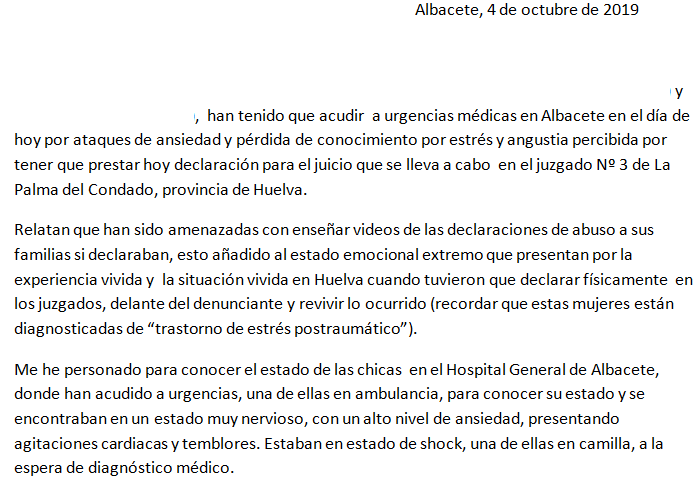 “Además de lo anterior, en el día de hoy [por el 4 de octubre] debía practicarse la declaración por videoconferencia de las denunciantes, no habiendo comparecido ninguna de ellas en la sede judicial”, lo que fue recogido en diligencia de constancia también de 4 de octubre donde se manifiesta que, “a las 9,30 horas, se habló telefónicamente con el letrado de la Administración de Justicia del Servicio Común de Notificaciones y Embargos de Albacete”, quien informó al Juzgado de La Palma del Condado que “las denunciantes ni han comparecido ni van a comparecer”. El mismo letrado hizo llegar al magistrado onubense Serrano los informes médicos y psicológicos aportados por el abogado Jesús Díaz Formoso, quien sí acudió al juzgado castellano-manchego.