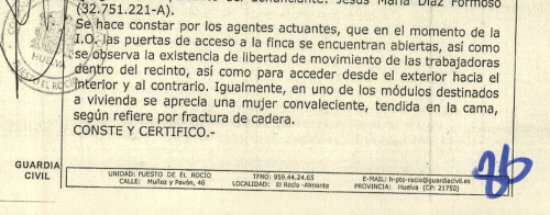 El informe de la Inspectora Galindo refiere que en una de sus visitas a la empresa, y «a la salida de uno de los módulos de viviendas se pudo apreciar la existencia de una chica marroquí con muletas, quien acudía a su cama. La empresa indicó que dicha trabajadora había tenido un accidente y se le ha puesto una prótesis de cadera». En un informe de la Guardia Civil que también consta en los diferentes autos del caso Doñana 1998, se menciona «una mujer convaleciente, tendida en la cama, según refiere por fractura de cadera». Varias fuentes sanitarias consultadas por La Mar de Onuba coinciden en que, por cuestiones de salud e higiene, pasar la convalecencia en los módulos compartidos descritos anteriormente «no es aconsejable» tras una intervención de esas características.