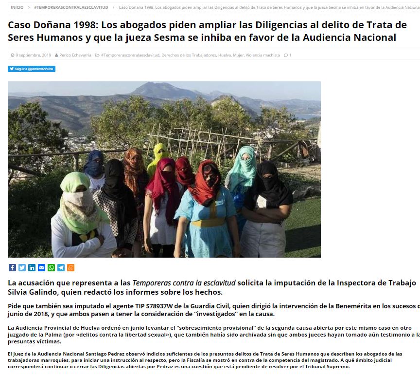 El pasado 7 de octubre, tras una reunión informal de varias mujeres del colectivo feminista onubense (convocada expresamente para comentar las recientes informaciones acerca del caso Doñana 1998, en el contexto socioeconómico y cultural de la contratación en origen de trabajadoras marroquíes), Esther Carbajo, del movimiento onubense Mujeres 24 horas, comentó a La Mar de Onuba que «lo prioritario en este momento es que estas mujeres reciban la ayuda psicológica y social que la profesional que ha elaborado los informes periciales considera muy necesarios dados sus estados de ansiedad y estrés postraumático. Que se pueda proceder a su declaración con garantías para su integridad moral, y que puedan volver a sus casas sin sentirse socialmente señaladas por unas circunstancias que no han pedido vivir».