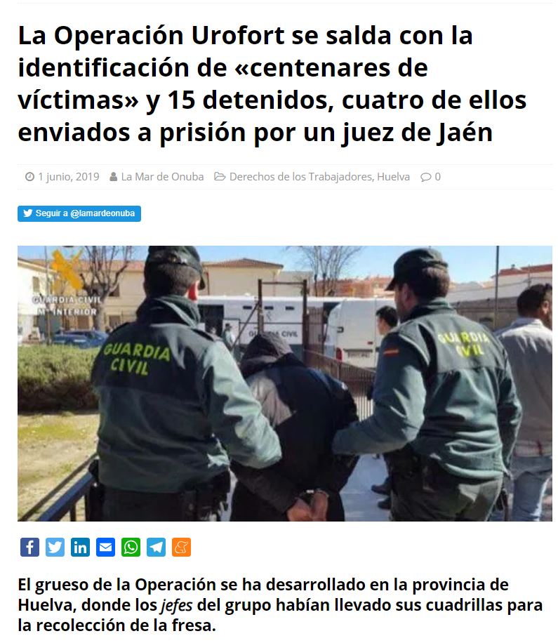 La operación Urofort, dirigida en mayo por la UCO en Huelva, y cuyos detalles se dieron a conocer ayer en Jaén, ha supuesto la mayor realizada en España contra tramas dedicadas a la trata de seres humanos con fines de explotación laboral. Este mismo año, en el mes de junio, se produjeron dos operaciones más contra redes de trata desmanteladas por la Guardia Civil, que volvían a azotar al campo onubense.
