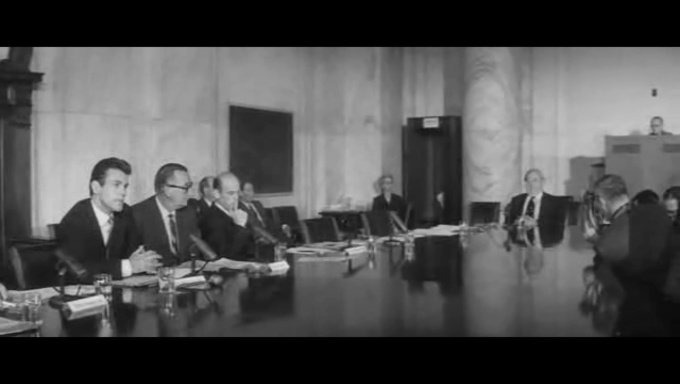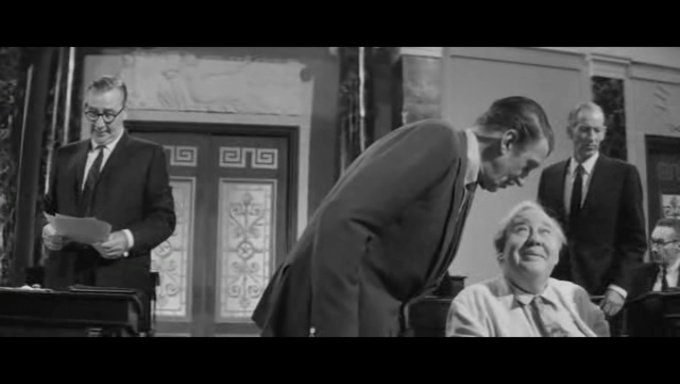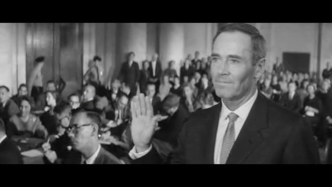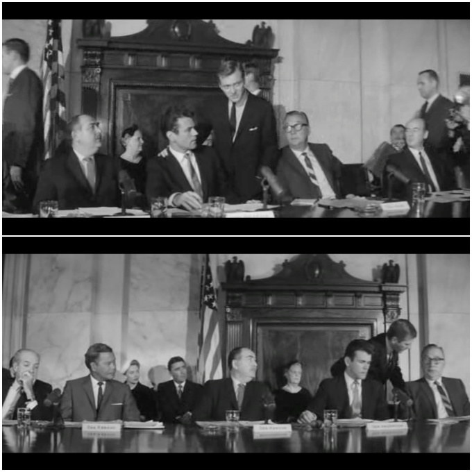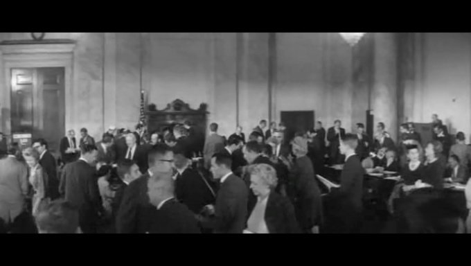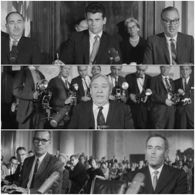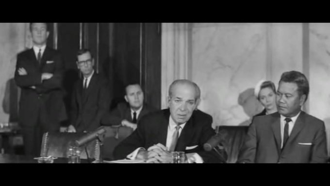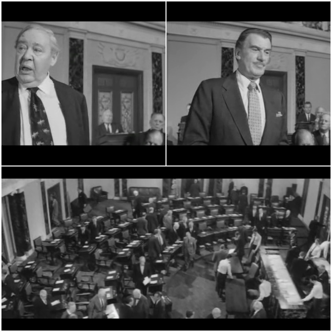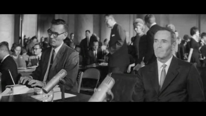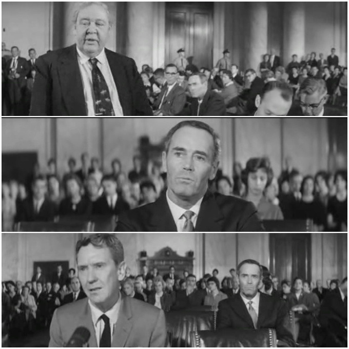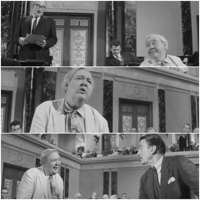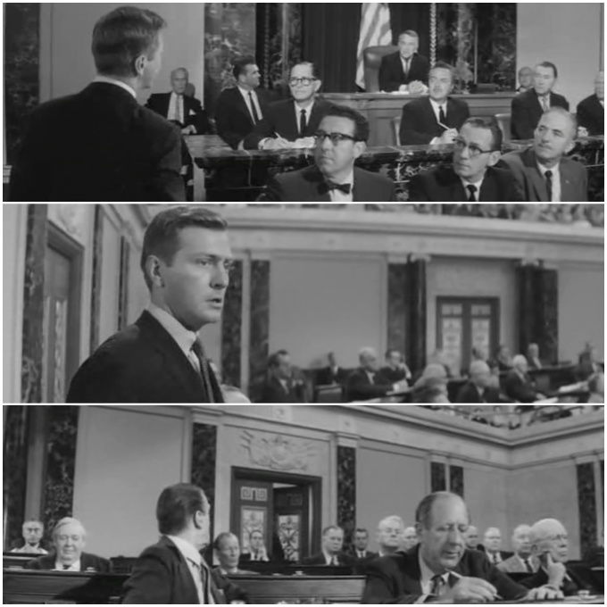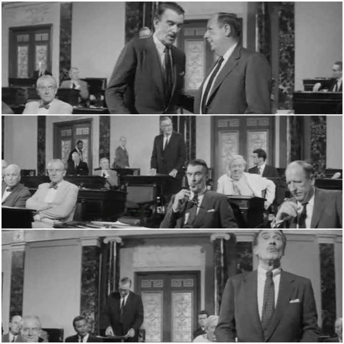 Sentado, tranquilo, con un asiento vacío y aislado de la multitud del fondo y del taquígrafo, al que Preminger concede gran relevancia visual en la secuencia como agente que fija las palabras. Así como cada movimiento de cámara está marcado por las consecuencias de la réplica, cada palabra es grabada y cada personaje es responsable de todo lo que dice. Son imágenes testigo, que dan fe de la acción política a plena luz.