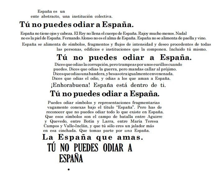 Nosotros preferimos la brisa tranquila de la mañana, sentir el agua grácil en los pies, una sosegada taza de café mientras releemos el Crátilo de Platón, un poco de hard sex con nuestras respectivas parejas y después bajar al bar a aprender directamente del Pueblo sus máximas y refranes. Y si esos señores que usted dice no están preocupados por la idea de España, quizás sean de fuera. No hay nada más español que hablar de España.