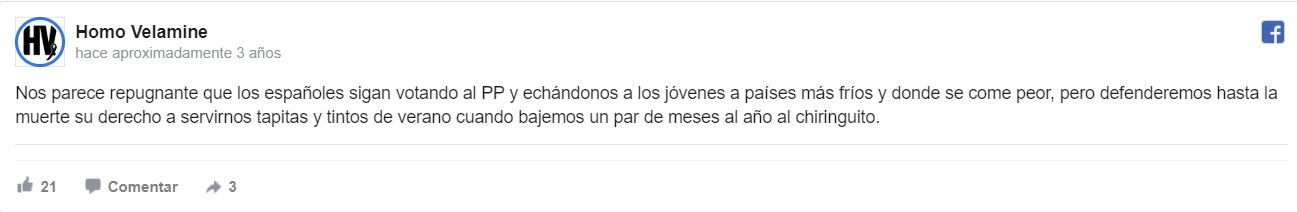 Asimismo, nuestros agentes están en todas las páginas de fans del PP, de apoyo al señor Rajoy, fans de Franco, etcétera. En estas páginas la Gente Entrañable, que bien pudiesen ser un magnífico vecino o la mecánica que le repara a usted el Seat 600, vuelca sus entrañas en dos minutos de odio con comentarios como "la democracia es respetar a los demás si por mi fuera te echaba de España". Por ello recomendamos encarecidamente seguir a grupos como Francisco Franco Bahamonde Fans Club. Tremendamente educativo.