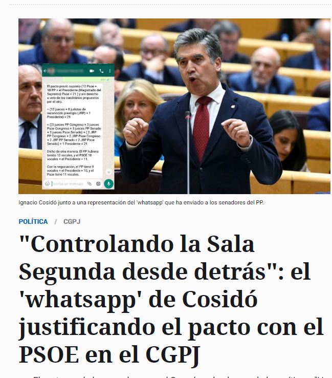 Con todo, no pudo ser. Un oportuno whatsapp del portavoz del PP en el Senado, Ignacio Cosidó, explicaba a sus conmilitones, críticos con el pacto entre el PP y el PSOE para renovar el CGPJ, que el acuerdo en ciernes era ampliamente beneficioso para la derecha. El PP permitía al sector llamado progresista del CGPJ contar con 11 vocales contra 9 de los conservadores, con la presidencia para Marchena. El pacto, explicó Cosidó, era muy bueno para el PP porque con él se estaba “controlando la Sala Segunda [la que enjuicia a los aforados] desde detrás”.