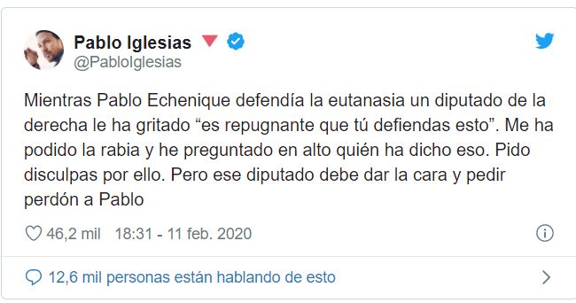 Mientras Echenique defendía la eutanasia desde la tribuna, el vicepresidente del Gobierno Pablo Iglesias ha publicado un mensaje en el que ha criticado a "un diputado de la derecha" que, según relata, "le ha gritado 'es repugnante que tú defiendas esto'". "Me ha podido la rabia y he preguntado en alto quién ha dicho eso", ha explicado Iglesias en el mensaje en el que ha pedido disculpas por ello y ha reclamado que el autor de esa crítica "debe dar la cara y pedir perdón a Pablo".