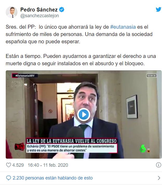 Por su parte, el presidente del Gobierno, Pedro Sánchez, ha asegurado que esta ley es "una demanda de la sociedad española que no puede esperar" y ha llamado a los diputados populares a "garantizar el derecho a una muerte digna" y no "seguir instalados en el absurdo y el bloqueo". "Señores del PP: lo único que ahorrará la ley de eutanasia es el sufrimiento de miles de personas", ha respondido en un mensaje en Twitter.