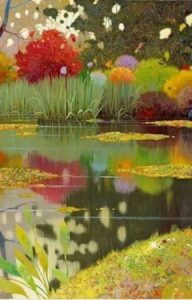 Iba saliendo hacia la superficie una rana, alternando las patadas y los abandonos de sus patas verdes. Cuando estuvo a flote saltó hacia una hoja de ninfea y se sentó en medio.