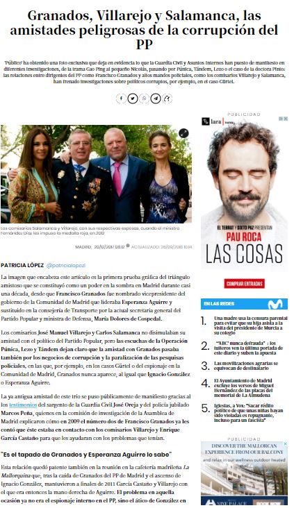 Si Esperanza Aguirre ha sido la única política en reconocer que se reunió con Villarejo sin necesidad de que este haga aflorar ningún audio de una reunión con ella, Carlos Salamanca es el "compadre" de Francisco Granados -como se refleja en el sumario de Púnica, aunque también mantiene una estrecha relación con Villarejo- y Enrique García Castaño lo es a su vez de otro ex presidente de la Comunidad de Madrid, Ignacio González.
