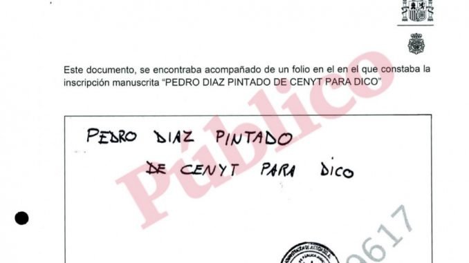 Sin embargo, en el registro de uno de los inmuebles del comisario Villarejo se encontró un documento que es bastante explícito sobre el conocimiento de Díaz Pintado de la relación de Cenyt y Dico, ya que es él mismo a quien va dirigido. En el encabezado se puede leer, manuscrito: "Pedro Díaz Pintado. De Cenyt para Dico" . Este documento consta en la pieza principal del sumario de la 'causa Tándem' y sorprende que ni juez ni fiscalía le preguntaran por él al testigo a finales de enero.