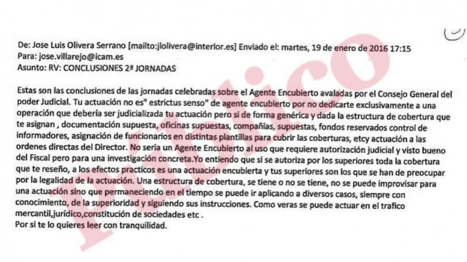 Otro documento que cita Podemos en su escrito, y que Público ofrece ahora en exclusiva, es un email en el que el comisario José Luis Olivera deja claro que Villarejo nunca fue un agente encubierto ni hacía misiones para el Estado. Olivera, que ahora trabaja para Luis Rubiales en la Real Federación Española de Fútbol, ha sido acusado por varios compañeros de ser el encargado de tapar las investigaciones contra el PP mientras fue jefe de la UDEF y de iniciar la época de informes falsos cuando ascendió a Comisario General de Policía Judicial. Sin embargo el juez aún no le ha llamado a declarar.