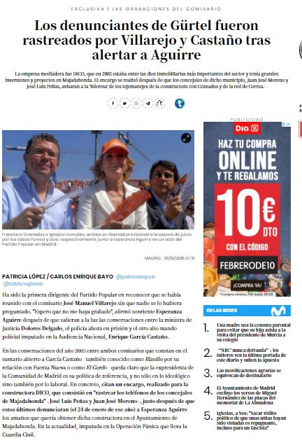 En noviembre de 2018, cuando Villarejo llevaba ya un año en la cárcel, el juzgado levantó parte del secreto de sumario, incluidas unas grabaciones del año 2005. En concreto, hay una de noviembre de 2005 (un mes después de que Moreno grabara al ejecutivo de Dico) en la que Villarejo y el comisario Enrique García Castaño citan un encargo realizado para la constructora Dico: "rastrear los teléfonos de los concejales de Majadahonda" –José Luis Peñas y Juan José Moreno–, justo después de que estos últimos denunciaran a Esperanza Aguirre la corrupción del PP, tal y como desveló Público en el artículo Los denunciantes de Gürtel fueron rastreados por Villarejo y Castaño tras alertar a Aguirre y en el que se pueden escuchar los audios de dicha conversación.